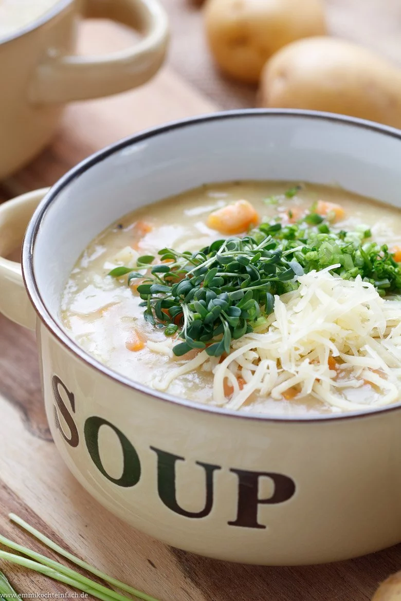 - Die cremige Suppe mit klein geschnittenem Schnittlauch und der Kresse sowie dem fein geriebenen Emmentaler servieren. Oder Wiener Würstchen wer nicht darauf verzichten möchte.