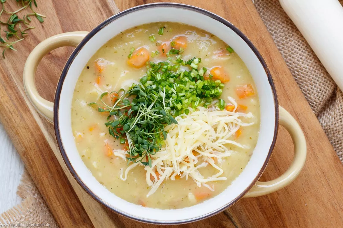 Mein Tipp: Zu guter Letzt kannst Du die Kartoffel Lauch Suppe mit frisch geriebenem Emmentaler krönen. Der Käse bringt zusätzlich Würze in die Suppe. Die frischen, gesunden Kräuter und der eiweißreiche Emmentaler-Käse bilden das i-Tüpfelchen.
