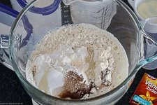 - Dann kommt zu Deinem Eigelb in die Schüssel noch 400 g Mehl, 400 ml Milch, 125 ml Mineralwasser, 100 g Zucker und 1 Päck. Bourbon-Vanillezucker sowie 1 Prise Salz. Alles gut mit den Quirlen des Handmixer oder der Küchenmaschine glatt rühren.