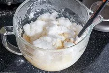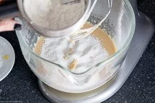 - Jetzt gibst Du Mehl/Stärke/Backpulver nach und nach zur Masse und rührst es unter.
