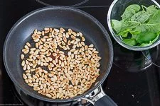 - Während dieser Zeit die Pinienkerne in einer Pfanne ohne Fett schön anrösten, die Basilikumblätter waschen trocknen und beides zur Seite stellen.