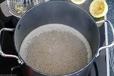- Die 500 ml Gemüsebrühe lässt Du gemeinsam mit dem Zitronensaft in einem großen Topf für ca. 12-15 Minuten köcheln bis sich die Menge circa auf die Hälfte reduziert hat.