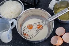 - Außerdem nutzt Du die Zeit und trennst die 3 Eier, vermengst/verquirlst die 3 Eigelbe mit 100 ml Sahne und würzt mit je einer Prise Muskat und Pfeffer. Den geriebenen Parmesan bereitstellen.