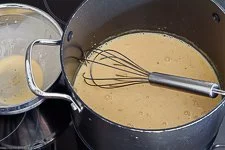 - Wenn die Brühe mit dem Zitronensaft eingekocht ist, reduzierst Du die Hitze Deiner Herdplatte auf eine untere Stufe (ich nehme Stufe 2 von insgesamt 9) und rührst die Eier-Sahne-Mischung hinein.