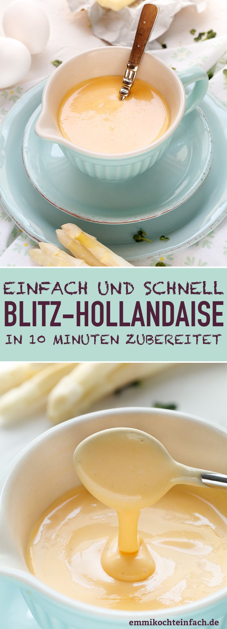 Sie ist der absolute Saucenklassiker zu Spargel. Aber auch wenn du kein Spargelfan bist, kannst du das Rezept für meine Blitz-Hollandaise für viele Gerichte verwenden. Die cremig-frische Hollandaise passt wie die Sauce Béarnaise zu Fisch, kurzgebratenem Fleisch, panierten Schnitzeln und zartem Gemüse wie Kartoffeln, Blumenkohl, grünen Bohnen oder Brokkoli hervorragend. Unter meinen Spargel-Rezepten findest du weitere Inspiration rund um das Stangengemüse, wie Spargel kochen, meine Blitz-Spargelcremesuppe und meine Spargelquiche.