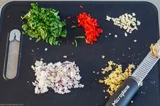- Die 1 Schalotte und die 2 Knoblauchzehen schälst Du und schneidest sie in feine Würfel. Die 1 Peperoni waschen, entkernen und ebenfalls fein schneiden. Ungefähr 10g Ingwer heiß abwaschen und mit Schale fein reiben. Circa 10g Koriander waschen, trocken schütteln und fein hacken.