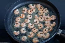 - Jetzt erhitzt Du 1 EL Butter in einer beschichteten, großen Pfanne bis sie schäumt und lässt darin die aufgetauten Garnelen für ca. 2 Minuten andünsten. Ein paar mal wenden. Dann nimmst Du sie aus der Pfanne und stellst sie beiseite.
