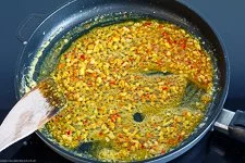 - Im Anschluss erhitzt Du weitere 4 EL Butter in der Pfanne bis sie schäumt und gibst folgendes hinein: Die Schalotten, die Knoblauch, die Peperoni, den Ingwer, 1 Messerspitze Chiliflocken, 1 EL Currypulver. Verrühren und ganz kurz alleine dünsten.