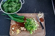 - Währenddessen wäscht Du die 100 g Babyspinat und die 4 Stück Frühlingszwiebeln. Die Frühlingszwiebeln schneidest Du in feine Ringe bis weit ins Grün hinein. Den Ingwer wäscht Du heiß ab und reibst ihn mit Schale fein für ca. 2 TL, die Knoblauchzehen schälst Du und reibst sie ebenfalls fein (oder die Knoblauchpresse vewenden).