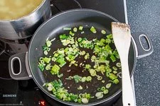 - Du erhitzt die 2 EL Olivenöl in einer großen Pfanne und lässt darin die Frühlingszwiebeln, den geriebenen Ingwer und die geriebenen Knoblauchzehen gemeinsam kurz andünsten. TIPP: Als Abwandlung könntest Du vorher in der Pfanne in etwas Öl entweder Tofu oder Hähnchenbrust braten und später wieder der Soße hinzufügen.