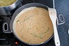- Mit den 400 ml Kokosmilch löscht Du ab und rührst alle weiteren Zutaten unter: 80 g Erdnussbutter, 3 EL Limettensaft, 2 EL Sojasoße, 2 Teelöffel Sambal Oelek sowie 2 TL brauner Zucker. Aufkochen lassen und kurz einköcheln bis es eine sämige Konsistenz hat (je nach Kokosmilch geht das sehr schnell). Mit Salz, Sambal Oelek oder Chiliflocken, Limettensaft aber auch Erdnussbutter schmeckst Du nach Belieben weiter ab.