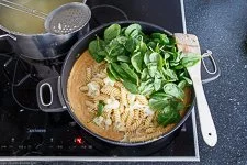 - Wenn die Nudeln und der Blumenkohl fertig sind kannst Du beides mit einem Schaumlöffel direkt aus dem Topf quasi tropfnass in die Pfanne zur Soße geben. Den Babyspinat ebenfalls dazu geben (evtl. grob hacken, wenn Du möchtest), unterheben und rühren bis er zerfallen ist. Wenn Dir die Soße zu dick ist einfach etwas heißes Nudelwasser unterrühren.