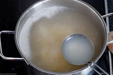- In der Zeit garst Du nach Packungsanweisung, in einem großen Topf, die Pasta in kochendem Salzwasser. Kurz vor Ablauf der Zubereitungszeit entnimmst Du 1 Schöpflöffel Nudelwasser, gießt die Pasta ab und gibst sie zurück in den Topf.