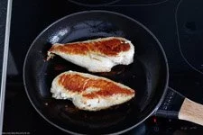- Jetzt erhitzt Du 1 EL Olivenöl und brätst darin auf mittlerer Stufe die Hähnchenbrustfilets 8 Minuten pro Seite an und würzt sie schon jetzt mit etwas Salz.