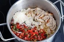 - Zum Schluss kommt das Bruschetta, die Hähnchenstücke, das Nudelwasser, der Parmesan zu den Nudeln in den Topf und wird damit vermengt.