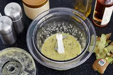 - Für die Vinaigrette die Green Kiwi schälen und mit allen Zutaten pürieren, entweder dem Pürierstab oder einer entsprechenden Küchenmaschine. Noch einmal nach Belieben abschmecken.