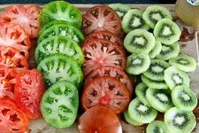 - Als erstes schneidest Du die gewaschenen Tomaten mit den geschälten Green Kiwi in gleich dicke Scheiben.