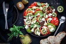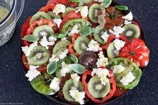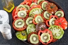 - Dann auf einem beliebigen Teller die Tomatenscheiben anrichten, 2 EL Olivenöl darüber verteilen, mit etwas Meersalz und grobem schwarzen Pfeffer würzen und mit den Green Kiwi Scheiben belegen.