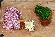 - Dann schälst du die 1 Zwiebel und die 2 Knoblauchzehen und schneidest alles in feine Würfel. Die Petersilie waschen, trocken schütteln und fein schneiden.