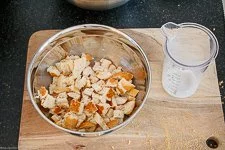 - In der Zwischenzeit schneidest Du die 2 Brötchen in kleine Würfel, gibst sie in eine große Schüssel, übergießt sie mit 200 ml Milch und lässt sie ca. 5 Minuten einweichen. Im Anschluss mit den Händen so weit wie möglich zu einer Masse kneten und dabei die Milch, die in den 5 Minuten Einweichzeit nicht aufgesogen wurde, herausdrücken. Die nicht aufgesogene Milch bitte nicht für die Pilzmasse nutzen sonst wird diese gegebenenfalls zu feucht/flüssig. HINWEIS: Die Brötchen können frisch oder altbacken sein, das ist egal. Je nach Brötchensorte wird die Masse homogen oder nicht. Es macht aber nichts, wenn in der Brötchenmasse noch Brötchenstücke sind.