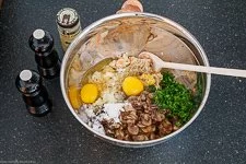 - Jetzt kommt zur Brötchenmasse wie folgt: Die leicht abgekühlte Pilz-Zwiebelmasse, die 2 Eier, 3 EL Speisestärke, gehackte Petersilie, 1/2 TL Senf, 1/2 TL Majoran, je eine Prise Salz, Pfeffer und Muskatnuss. Alles gut miteinander vermischen.