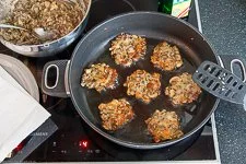 - In eine große Pfanne gibst Du so viel Pflanzenöl, dass der Pfannenboden 2-5 mm hoch bedeckt ist (also ordentlich) und lässt es schön heiß werden. Dann portionierst Du mit einem Esslöffeln die Champignon Frikadellen ins heiße Fett, drückst sie etwas platt und lässt sie auf beiden Seiten goldbraun braten. Auf Küchenpapier abtropfen lassen.