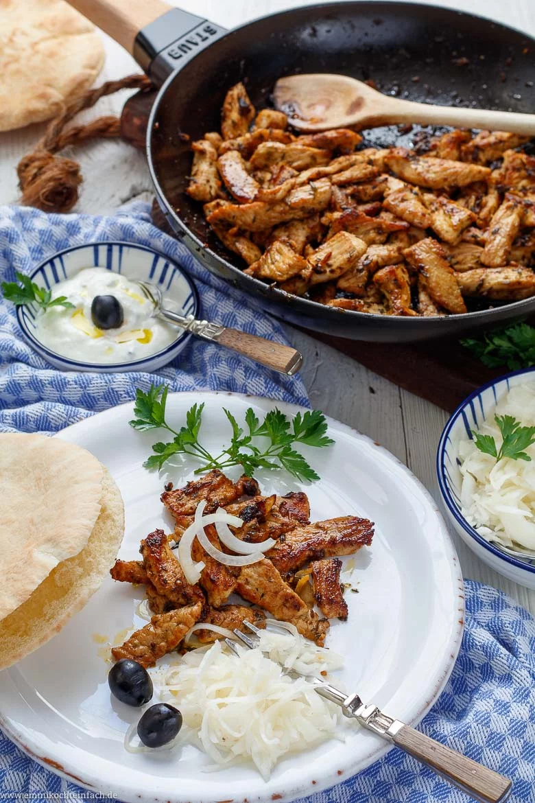In einem Rutsch fertige Gyrospfanne! Du wirst sehen, mit meinen Tipps für Gyros Geschnetzeltes brauchst Du nicht länger als 30 Minuten. Nur die Zeit fürs Marinieren, drei Stunden, solltest Du mit einplanen. Denn: Je länger das Fleisch mit den Gewürzen mariniert, desto besser das Ergebnis.