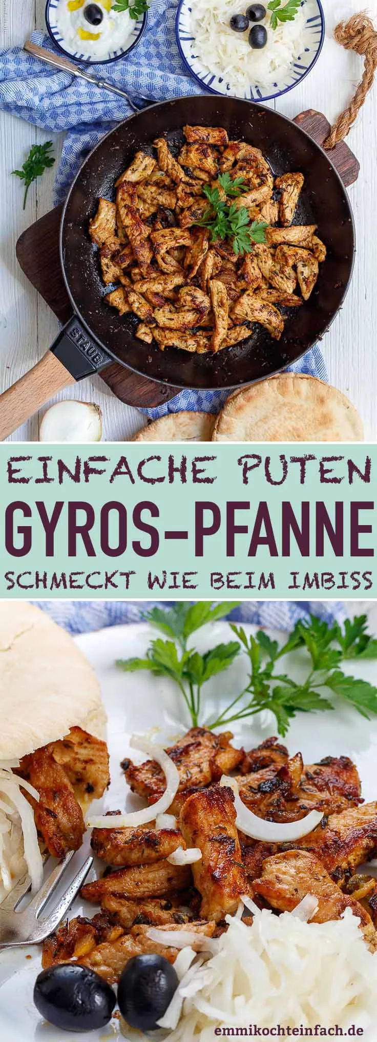- Die einfache Gyrospfanne schmeckt hervorragen mit selbstgemachten Pommes oder Wedges und Salat wie zum Beispiel Krautsalat. Auch lecker in Pita-Taschen serviert.