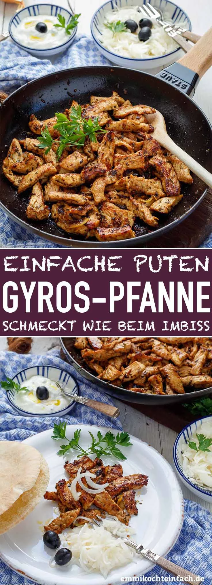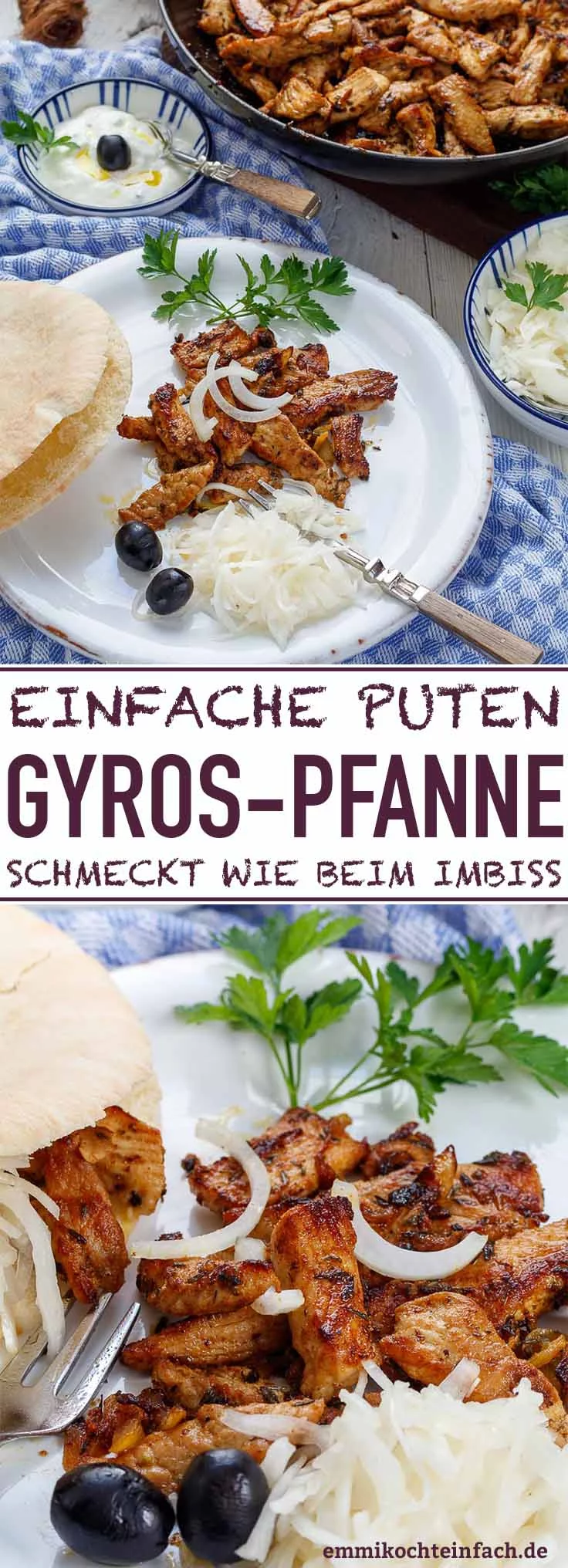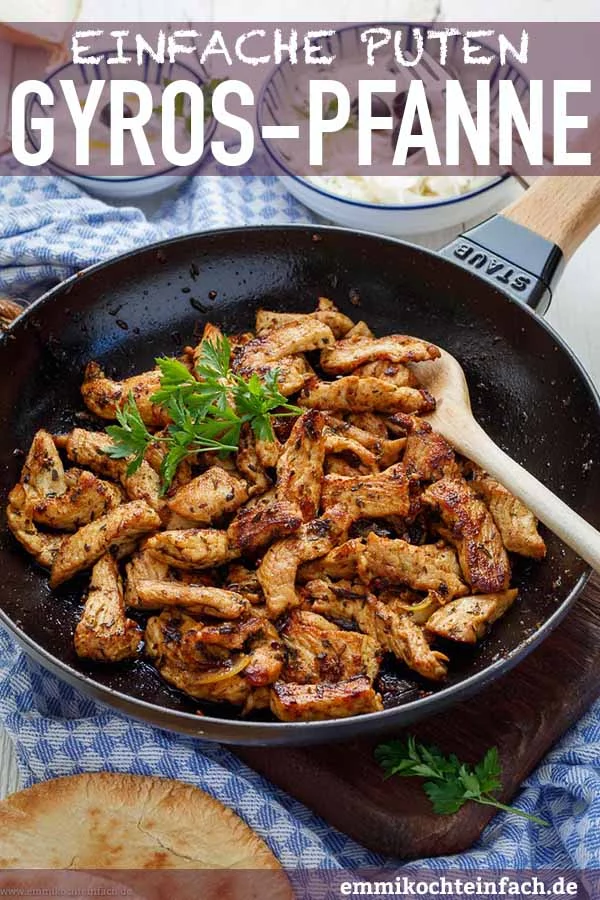 Ein Gyros selber machen geht wirklich einfach und mein Gyros Rezept schmeckt wie beim Griechen. Nur, dass es nicht vom Drehspieß kommt, sondern wie ein Geschnetzeltes in der Pfanne zubereitet wird. Denn wer hat schon einen Drehspieß in der Küche? Die Zutatenliste für meine Gyrospfanne ist wirklich überschaubar, denn Du brauchst keine frischen Kräuter oder spezielles Gyros Gewürz, der Einkauf hält sich also in Grenzen. Und das Fleisch kannst Du variieren: Pute, Huhn oder Schwein.