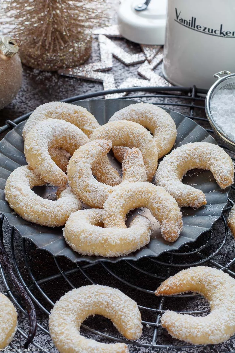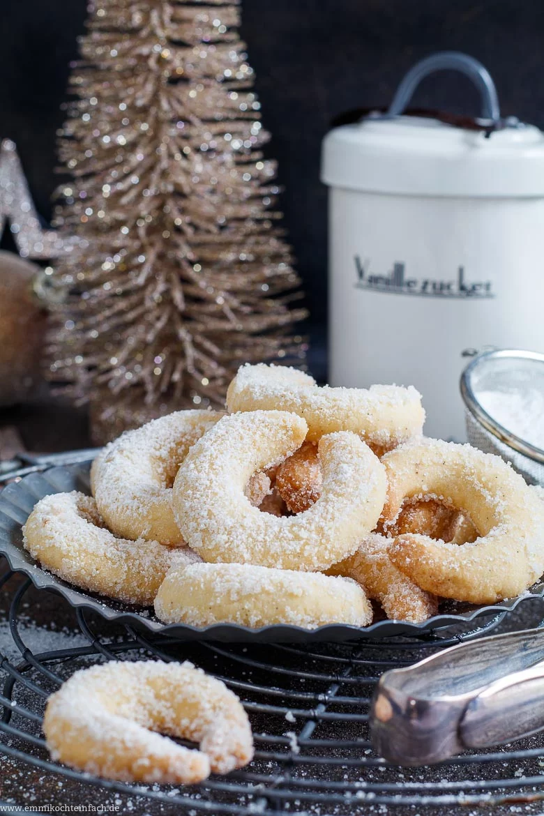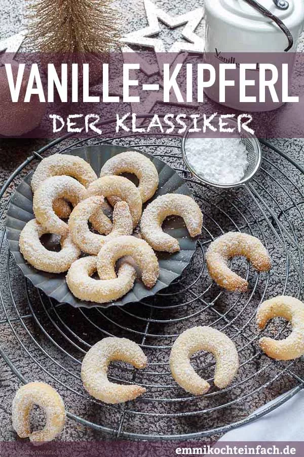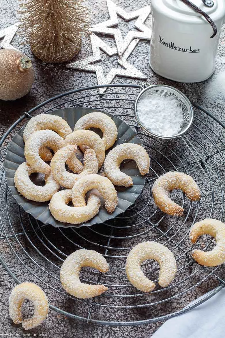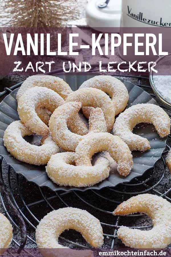 - Zu guter Letzt vermischt du 4 Päckchen Vanillezucker (ca. 32 g) in einer Schüssel mit 2 EL Puderzucker (ca. 15 g). Wenn du die Kipferl aus dem Ofen nimmst, lässt du sie nur ganz kurz ruhen bzw. nur so lange bist du sie anfassen kannst. Dann wälzt du sie vorsichtig von beiden Seiten in dem Zuckergemisch und lässt sie auf einem Kuchengitter auskühlen. Wenn sie heiß sind haftet der Zucker besser. Alternativ kannst du sie auch kräftig mit dem Zuckergemisch bestäuben. Wenn der Zucker beim Wälzen ausgeht, einfach neuen vermengen.