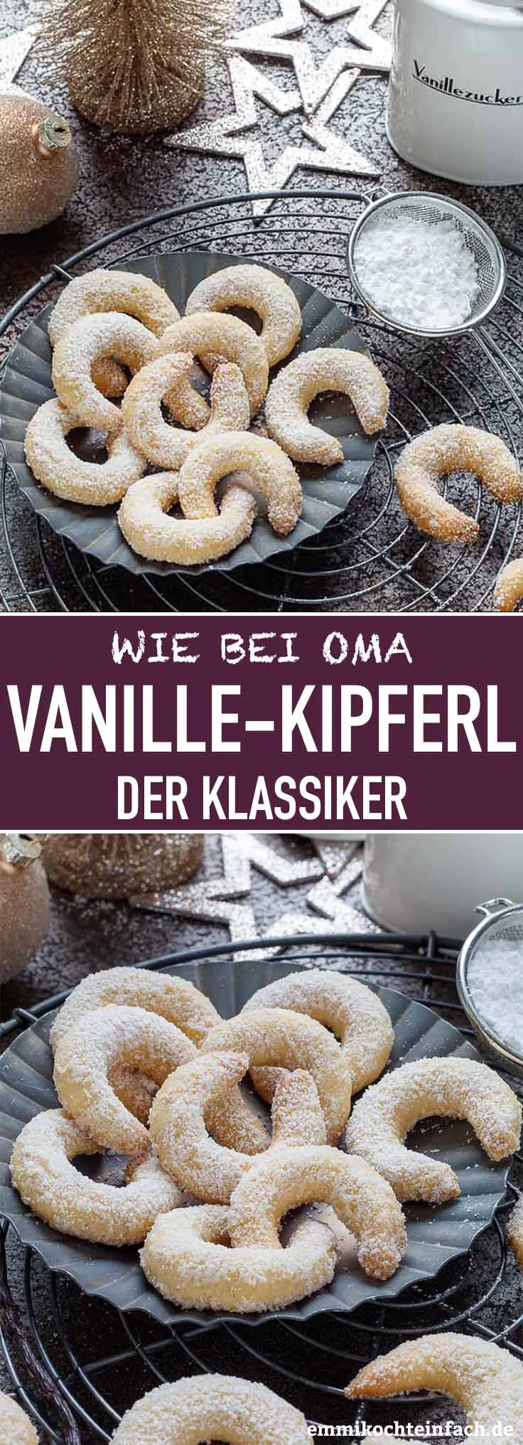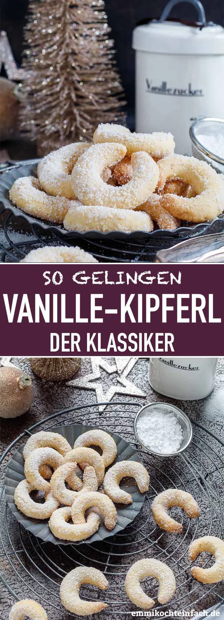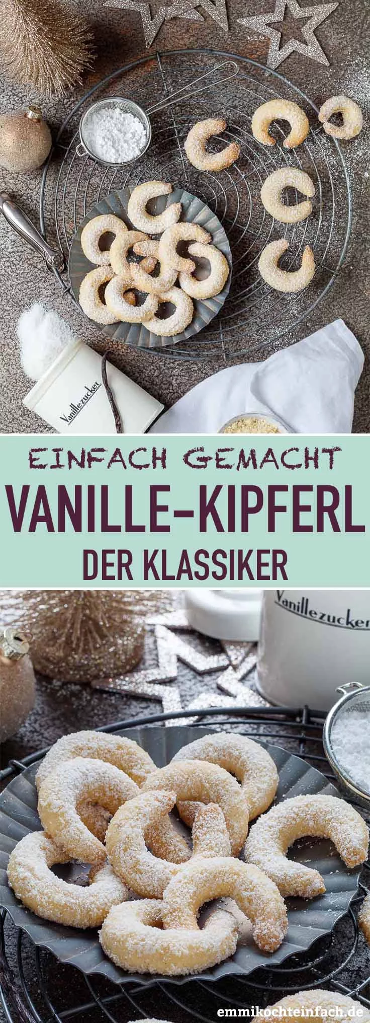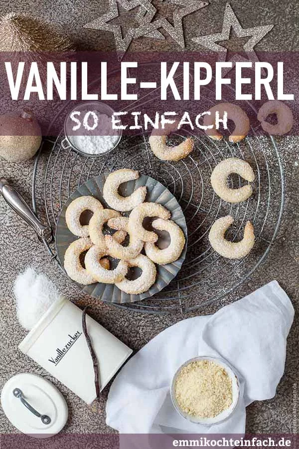 - Zu guter Letzt vermischt du 4 Päckchen Vanillezucker (ca. 32 g) in einer Schüssel mit 2 EL Puderzucker (ca. 15 g). Wenn du die Kipferl aus dem Ofen nimmst, lässt du sie nur ganz kurz ruhen bzw. nur so lange bist du sie anfassen kannst. Dann wälzt du sie vorsichtig von beiden Seiten in dem Zuckergemisch und lässt sie auf einem Kuchengitter auskühlen. Wenn sie heiß sind haftet der Zucker besser. Alternativ kannst du sie auch kräftig mit dem Zuckergemisch bestäuben. Wenn der Zucker beim Wälzen ausgeht, einfach neuen vermengen.