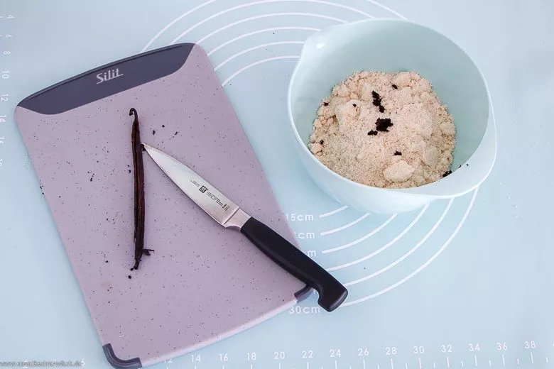 - Zuerst vermengst du die 100g gemahlenen Mandeln mit dem Mark der Vanilleschote. Die Schote dafür aufschlitzen, das Mark mit einem Messer herauskratzen und zu den Mandeln geben, dabei zwischen den Händen verreiben und das Mark gut verteilen.