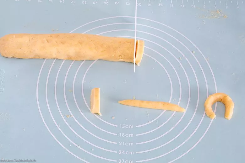 - Die erste Teigrolle aus dem Kühlschrank nehmen und in ca. 1 cm dicke Scheiben schneiden, auf einer ganz leicht bemehlten Fläche formst/rollst du jede Scheibe zu einem fingerdicken Würstchen, das ungefähr 7-10 cm lang ist und an beiden Enden idealerweise spitz zuläuft.WICHTIGER HINWEIS: Je mehr Mehl auf deiner Arbeitsfläche ist und je mehr Mehl du bei diesem Schritt in die Kipferl einarbeitest, desto bröseliger / zerbrechlicher werden sie hinterher.