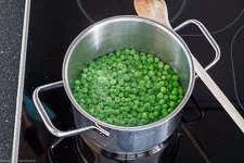 - Zuerst gibst Du die Erbsenmenge (tiefgekühlt) in einen Topf mit etwa 100 ml leicht gesalzenem Wasser und lässt diese für ca. 10 Minuten bei kleiner Hitze gar köcheln.