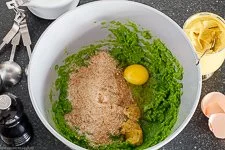 - Jetzt kommen folgende Zutaten zu dem Erbsenpüree: 1 Ei, 40 g Semmelbrösel (ca. 4 EL), 2 TL Senf, 1/2 TL Salz, jeweils 1 Prise gemahlener Pfeffer und Muskatnuss.