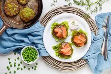Erbsen eignen sich ganz toll als Tiefkühlprodukt (gibt es auch Bio), sind vielseitig und können vor allem im Herbst und Winter gesunde Abwechslung auf den Tisch zaubern. Deshalb habe ich sie auch in Erbsen Bratlinge „verbraten“. Die schnell gemachten Erbsen Bratlinge mit Räucherlachs sind eine leckere und gesunde Zwischenmahlzeit und wer mag kann noch einen Dip, zum Beispiel Kräuter Creme Fraîche dazu reichen.