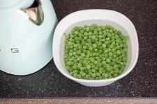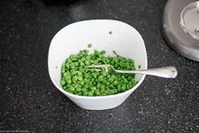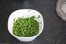 - Dann gießt Du das Wasser ab, gibst die Erbsen zurück in die Schüssel und zerdrückst sie grob mit einer Gabel.