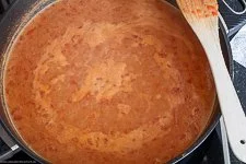 - Jetzt verrührst Du kurz die Erdnussbutter in der Pfanne und gießt mit der Hühnerbrühe und den stückigen Tomaten auf sowie einer Prise Salz, 1 1/2 TL Kreuzkümmel und 1 1/2 EL Honig.