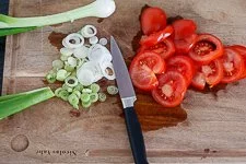 - Dann wäscht Du die Tomaten und Frühlingszwiebeln und schneidest beides in Scheiben bzw. Ringe.
