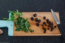 - Die Oliven abtropfen lassen und vierteln sowie die Oreganoblättchen etwas hacken.