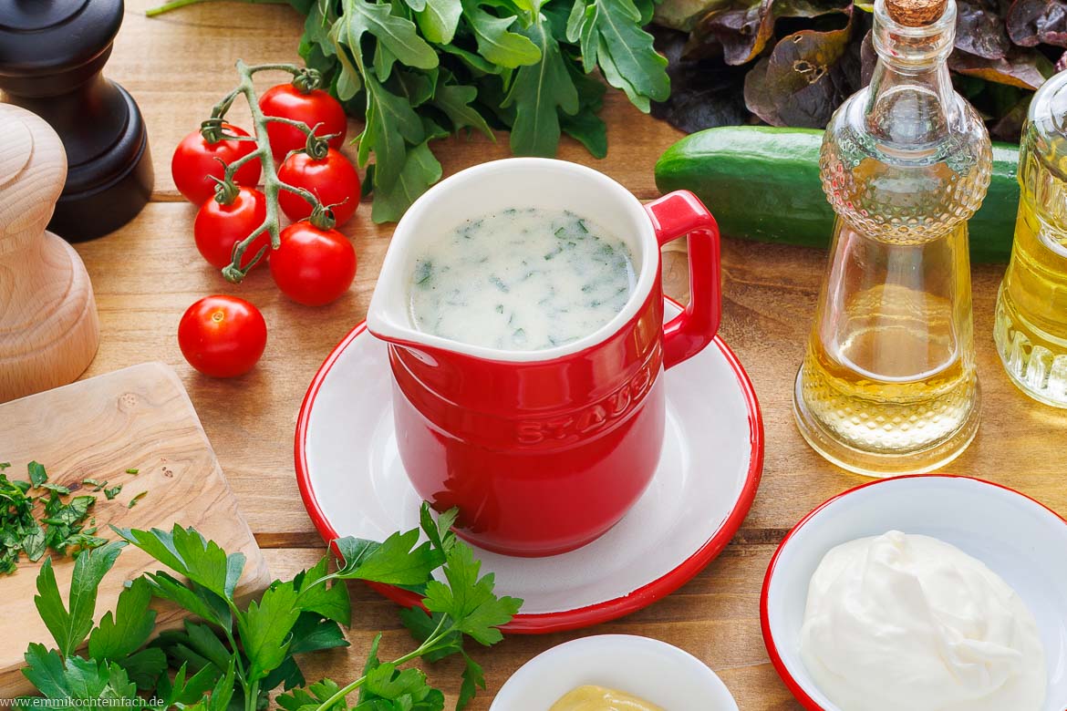 Den cremigen Salatsauce-Klassiker selber machen lohnt sich. Nicht nur wegen der ganzen überflüssigen Zusatzstoffe, Geschmacksverstärker und Verdickungsmittel, die bei Supermarkt-Produkten eingesetzt werden.
