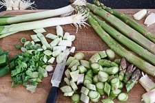 - Im Anschluss, wäscht Du den grünen Spargel, entfernst die holzigen Enden (nach Belieben auch den unteren Teil schälen) und schneidest ihn in ca. 1 cm lange Stücke. Die Frühlingszwiebeln waschen und bis ins Grün ebenfalls in Ringe schneiden, allerdings das sehr dunkle Grün nicht mehr. Die Knoblauchzehen entweder schälen oder mit einem Messerrücken andrücken.