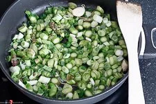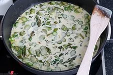 - Nun zerlässt Du die Butter in einer großen Pfanne und gibst den Spargel und die Frühlingszwiebeln sowie die beiden Knoblauchzehen hinein und lässt es für ca. 5 Minuten auf mittler Stufe dünsten.