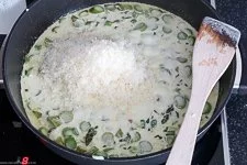 - Danach gießt Du die Sahne dazu, lässt sie ganz kurz (halbe Minute) köcheln, rührst den Parmesan nach und nach langsam unter bis er geschmolzen ist. Bitte die Soße jetzt nicht mehr aufkochen lassen, denn Parmesan kann ab 65 °C klumpen. Zum Schluss noch mit Salz und Pfeffer abschmecken.TIPP: Bitte den Parmesan frisch vom Stück reiben und keinen gekauften aus der Tüte verwenden. Vor allem die, bei denen der Käse fast schon pulverisiert ist! Auch hier besteht die Gefahr, dass der Käse schon bei niedrigeren Temperaturen klumpt. Das kann auch an den Trenn- und Konservierungsmitteln liegen.