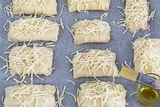 - Deine 10 Käse Schinken Teiglinge auf ein mit Backpapier ausgelegtes Backblech legen, jedes leicht mit Öl bestreichen und den geriebenen Gouda darüber verteilen.
