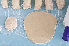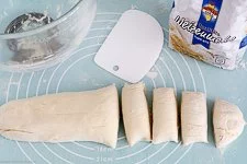 - Den Teig formst Du nun zu einer ca. 30 cm langen Rolle (Durchmesser kann zwischen 5 und 7 cm sein, wie viel ist aber letztendlich nicht so wichtig) und schneidest diese in ca. 10 einigermaßen gleichmäßig große Stücke.