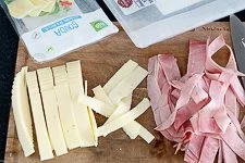 - Jetzt noch den Schinken und den Käse in grobe Streifen schneiden.