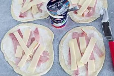 - Schinken- und Käse-Streifen verteilst Du so gut es eben geht gleichmäßig auf den Fladen.