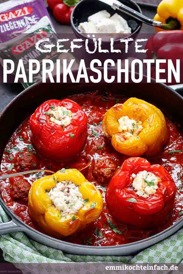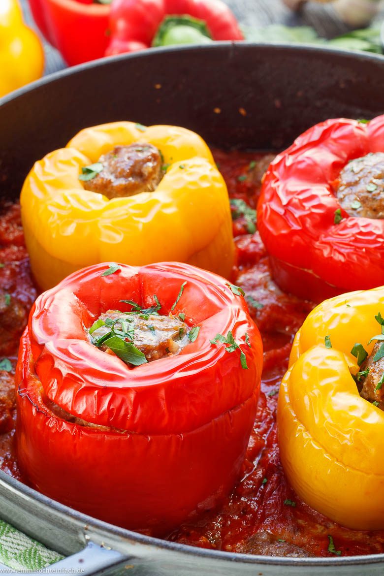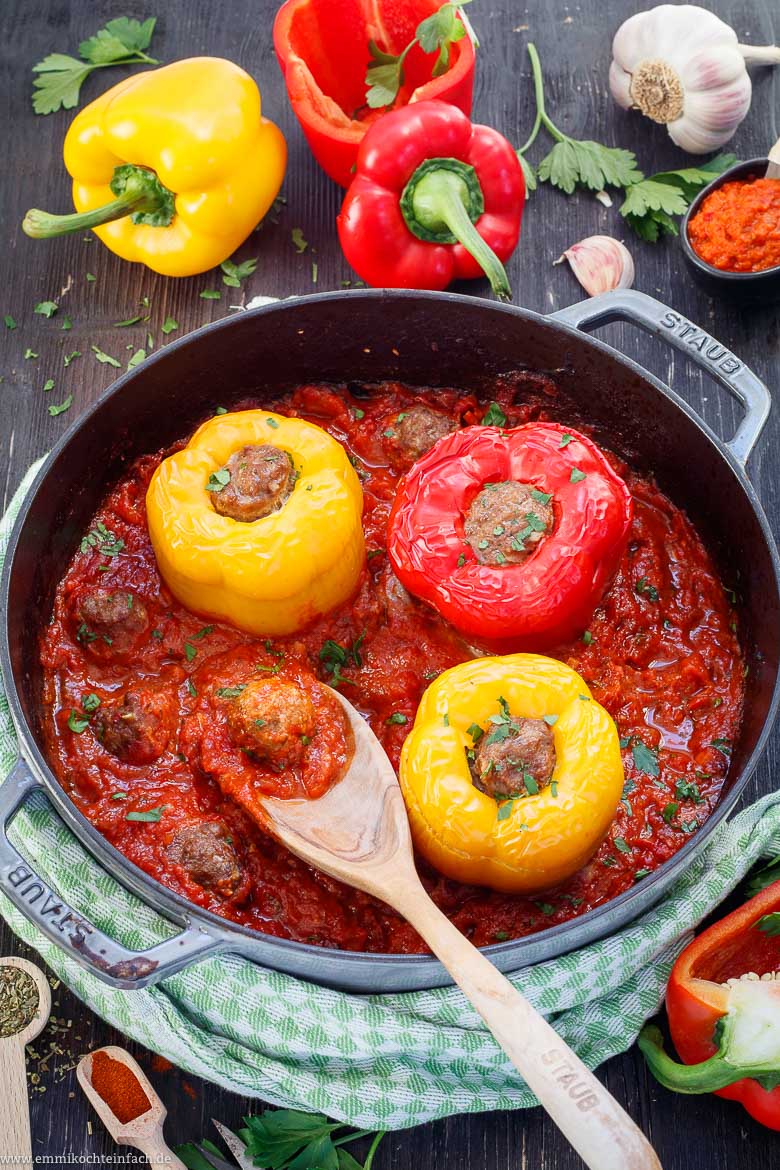 - Dann stellst Du die gefüllten Paprikaschoten in die Soße hinein und verteilst die vorhandenen Hackbällchen. Im vorgeheizten Backofen (Mitte) mit Deckel für 30 Minuten garen lassen. Im Anschluss ohne Deckel für weitere 15 Minuten garen. Wenn Du sie oben noch rösten willst, für ein paar Minuten den Grill anmachen.TIPP: Solltest Du keine ofenfeste Pfanne besitzen, kannst Du selbstverständlich eine Auflaufform verwenden. Die hergestellte Soße hineingießen sowie die Paprikaschoten und Hackbällchen hineingeben. Zum Abdecken zum Beispiel Alufolie verwenden.