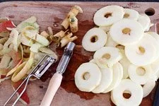- Jetzt bereitest Du schon einmal die Äpfel vor: Nämlich waschen, schälen und die Kerngehäuse mit einem Apfelausstecher entfernen (oder vierteln und entkernen) und in ca. 2 mm dicke Scheiben schneiden.